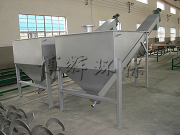 來(lái)自沉砂池的砂水混合物進(jìn)入砂水分離槽中,進(jìn)行砂水分離,水溢出池外,砂沉到槽底。轉(zhuǎn)動(dòng)的螺旋軸將砂沿25°螺旋槽輸送到頂部出料口,砂在輸送過(guò)程中進(jìn)一步分離,從而保證出料口的砂含水率不大于60%。