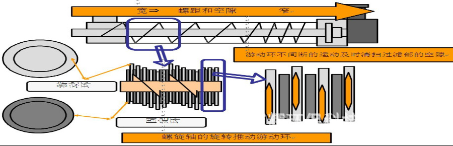 以上圖像示意疊螺主體由固定環(huán)和活動環(huán)相互重疊組成,前段為濃縮過濾,后段為擠壓出泥。螺旋軸貫穿其中并帶動環(huán)片中的活動環(huán)轉(zhuǎn)動從而達到逐步脫水的目的,螺旋軸的間隙不斷減小,使得其中壓力不斷增強,使其充分脫水。達到降低含水量出泥的目標,同時在環(huán)片轉(zhuǎn)動擠壓的過程中也起到了清洗環(huán)片的作用。