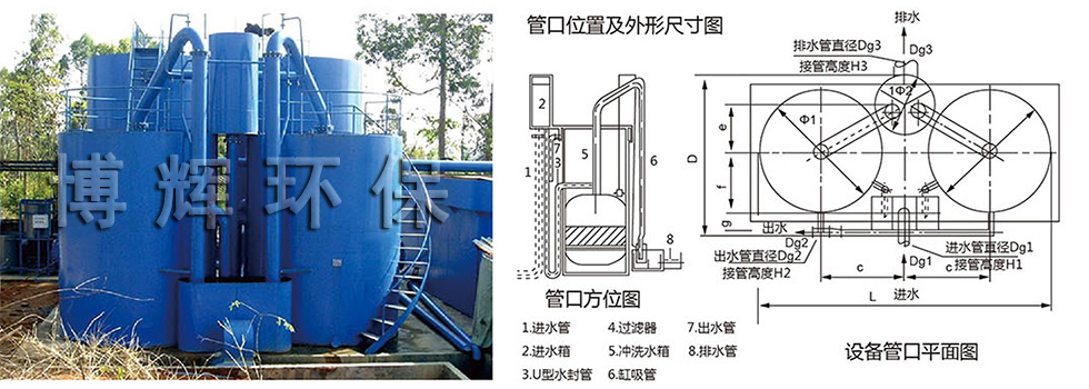 無閥過濾器剛投入運(yùn)行時(shí),濾料層較清潔,虹吸上升管內(nèi)外的水面差標(biāo)志著濾池初期水頭損失,一般約為20cm。隨著過濾的進(jìn)行,濾層中雜質(zhì)漸增多,其阻力也就慢慢變大,但因進(jìn)水流量不變,所以進(jìn)水管和虹吸上升管中的水位便自動(dòng)地慢慢上升。