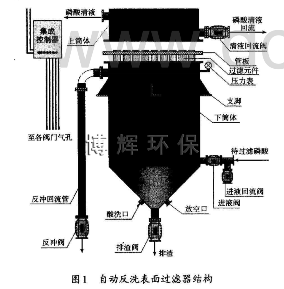 自動反洗表面過濾器是利用自身過濾的清液來完成反沖洗過程,反沖洗時不需要排空過濾器,反沖洗過程可在數(shù)秒內(nèi)完成,反沖洗結(jié)束后過濾器又可進行過濾,反沖洗下來的濾渣由排渣口排出,整個過程由電腦自動控制。