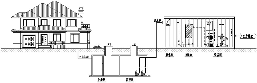 調(diào)節(jié)池內(nèi)設(shè)置提升泵,將污水自動提升到BH-JZ型一體化污水處理設(shè)備中。